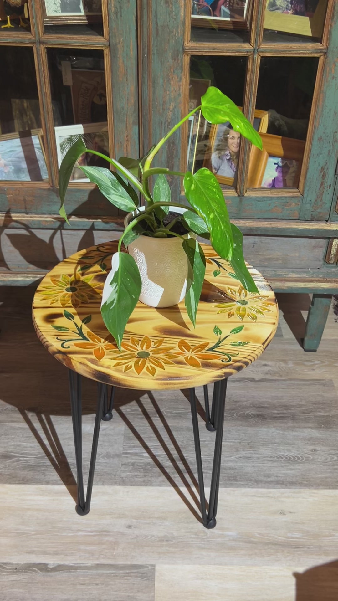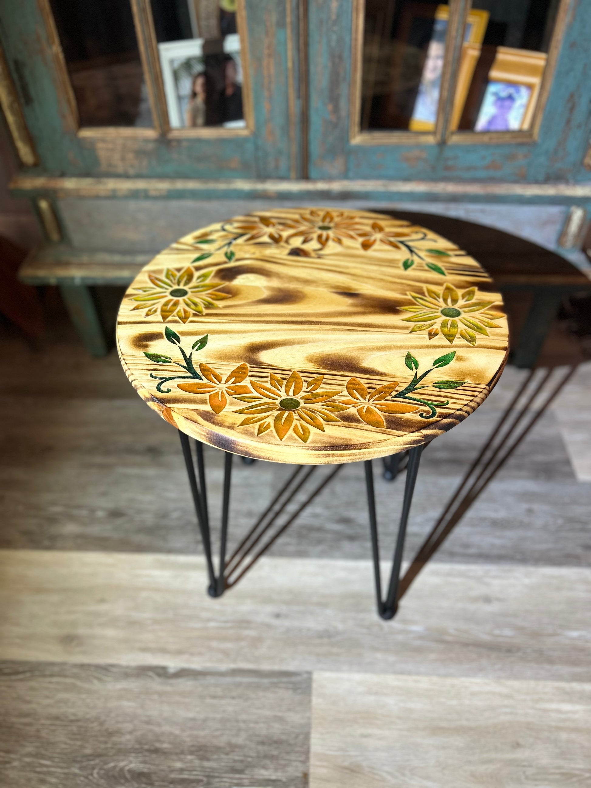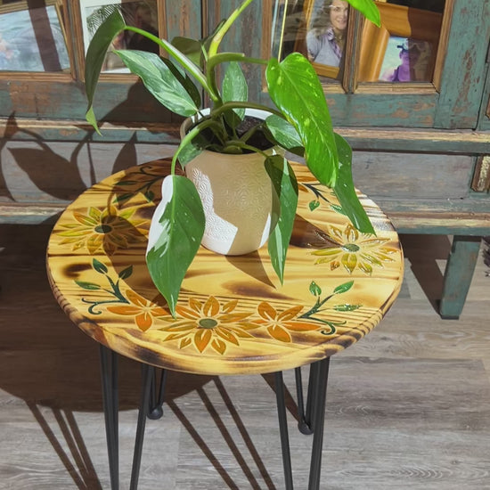 Add a touch of whimsy to your plant display with our engraved color filled plant table. This 18" round accent table is adorned with beautifully engraved and color-filled flowers. Showcase your favorite plant in style!