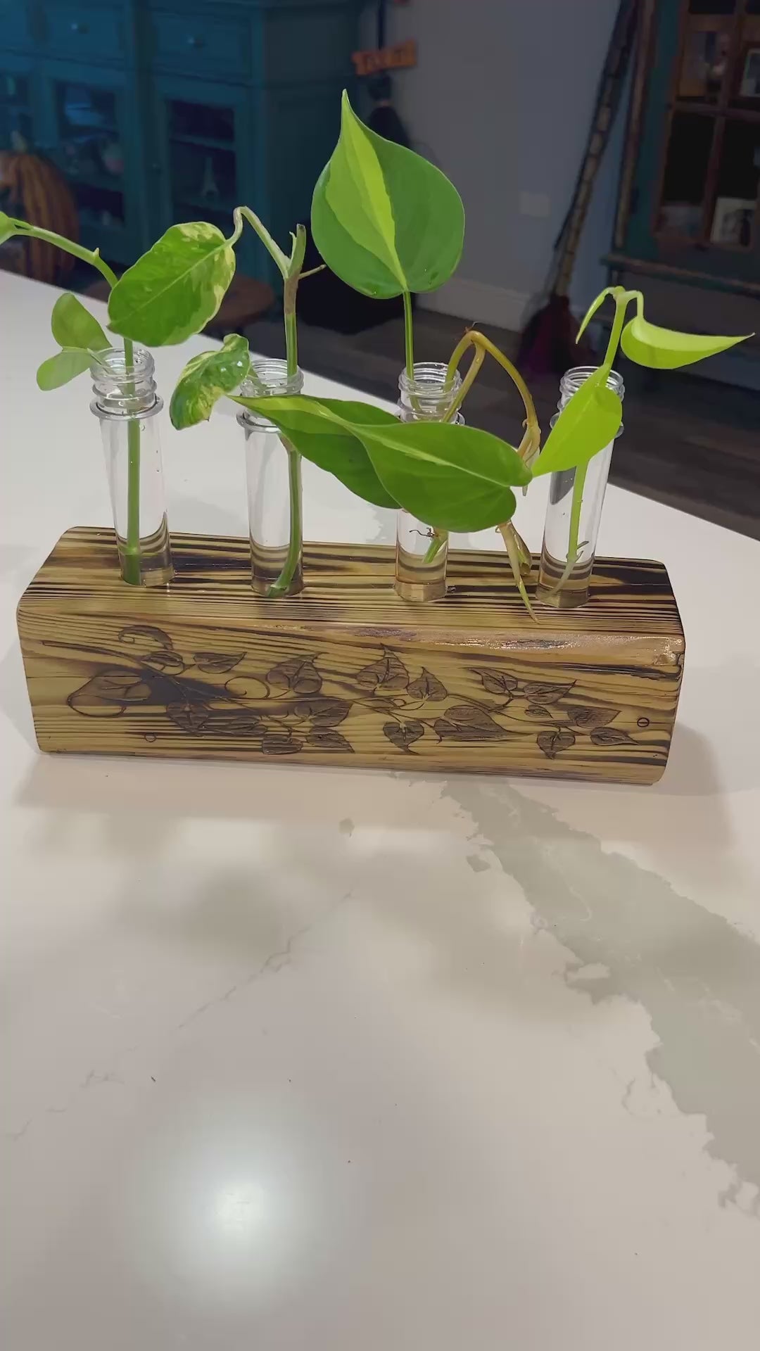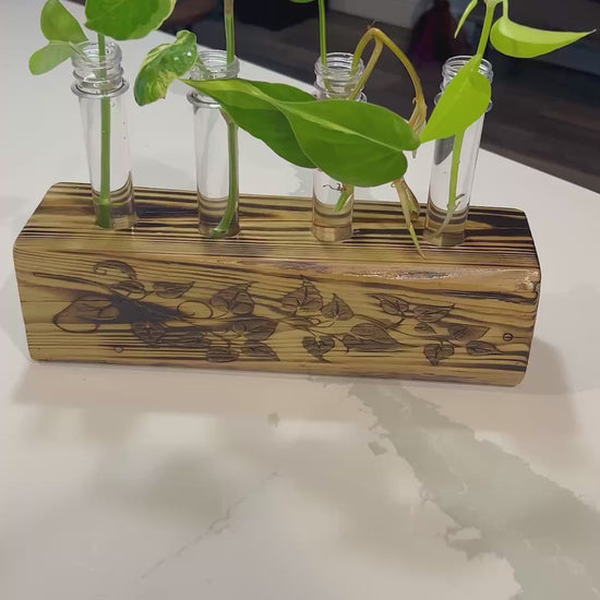 Watch your plant babies grow in style! This beautifully engraved solid wood propagation station is the perfect home for rooting cuttings. We've included starter cuttings of four pothos and philodendron varieties to get you started on your propagation journey. Display it proudly on a shelf or windowsill while your new plants develop roots and prepare to thrive in soil. A gorgeous way to expand your plant collection and share the green love with friends!