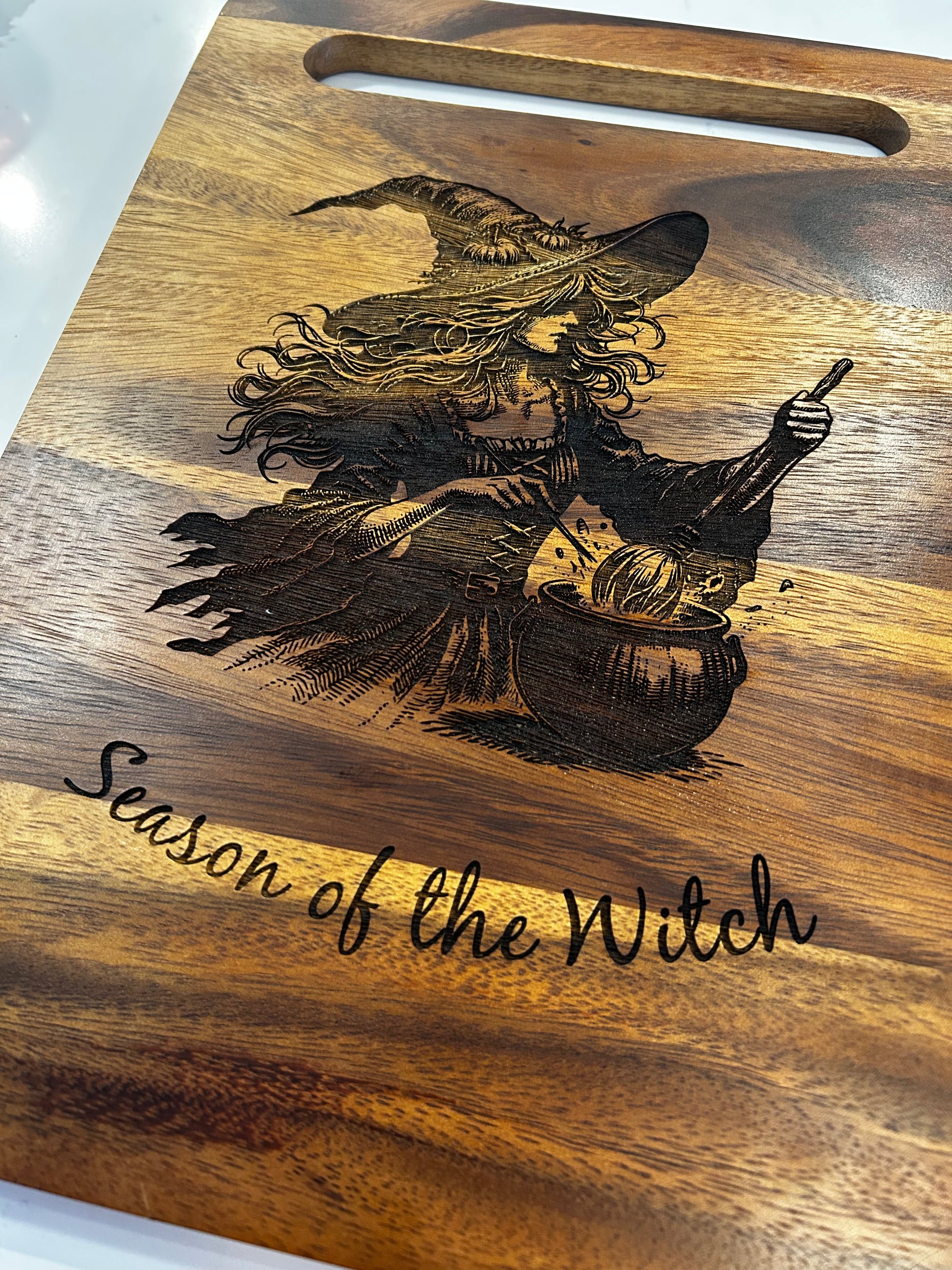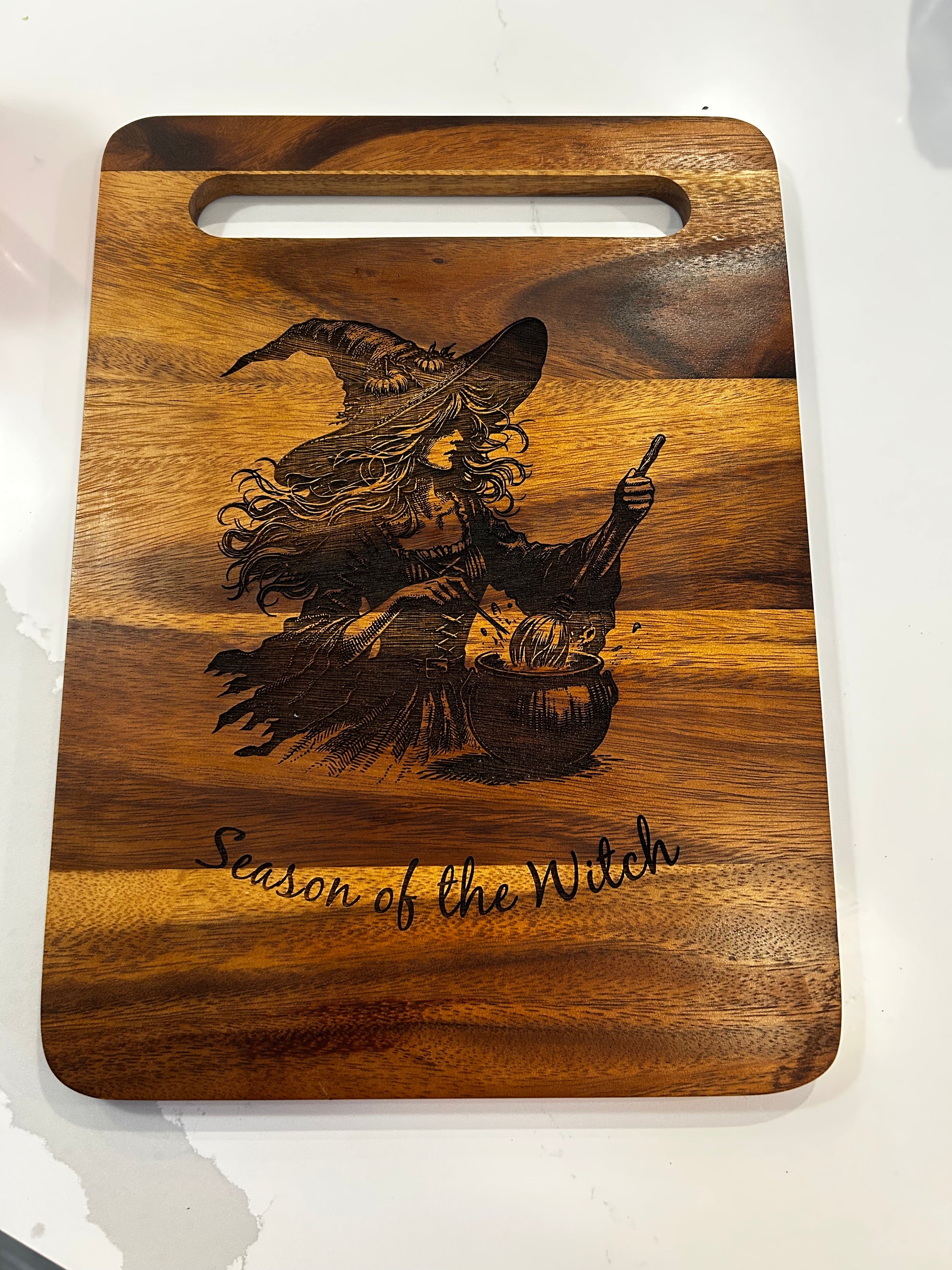 Introducing our Season of the Witch Charcuterie Board - a beautifully engraved board ready to elevate your Halloween parties. With its eerie vibe and convenient design, this board is perfect for serving up delicious snacks and magically delightful treats. Don't wait, grab yours before it disappears! Measures 11x15